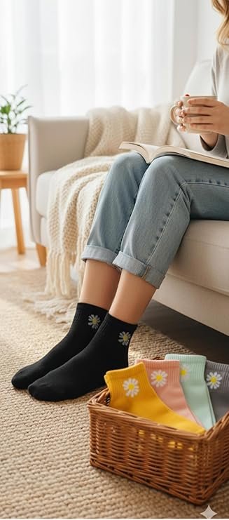 • PACK CONTENTS: Set of 5 pairs of ankle-length socks featuring charming daisy pattern designs in grey, light blue, pink, orange, and black colours