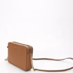 Elevate your everyday carry with this Michael Kors Tan Jet Set Crossbody Bag, a timeless accessory that seamlessly transitions from day to night. Crafted in a versatile tan leather, this structured crossbody features signature gold-tone hardware and a secure zip closure to keep your essentials protected. The chain-linked shoulder strap offers both style and functionality, allowing you to wear it crossbody or adjusted to your preferred length.